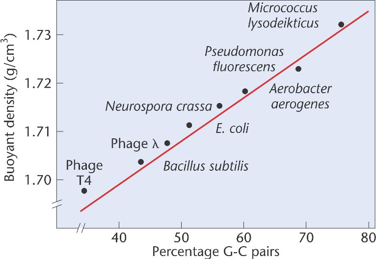 Since G-C base pairs in DNA are denser than A-T pairs, the percentage of